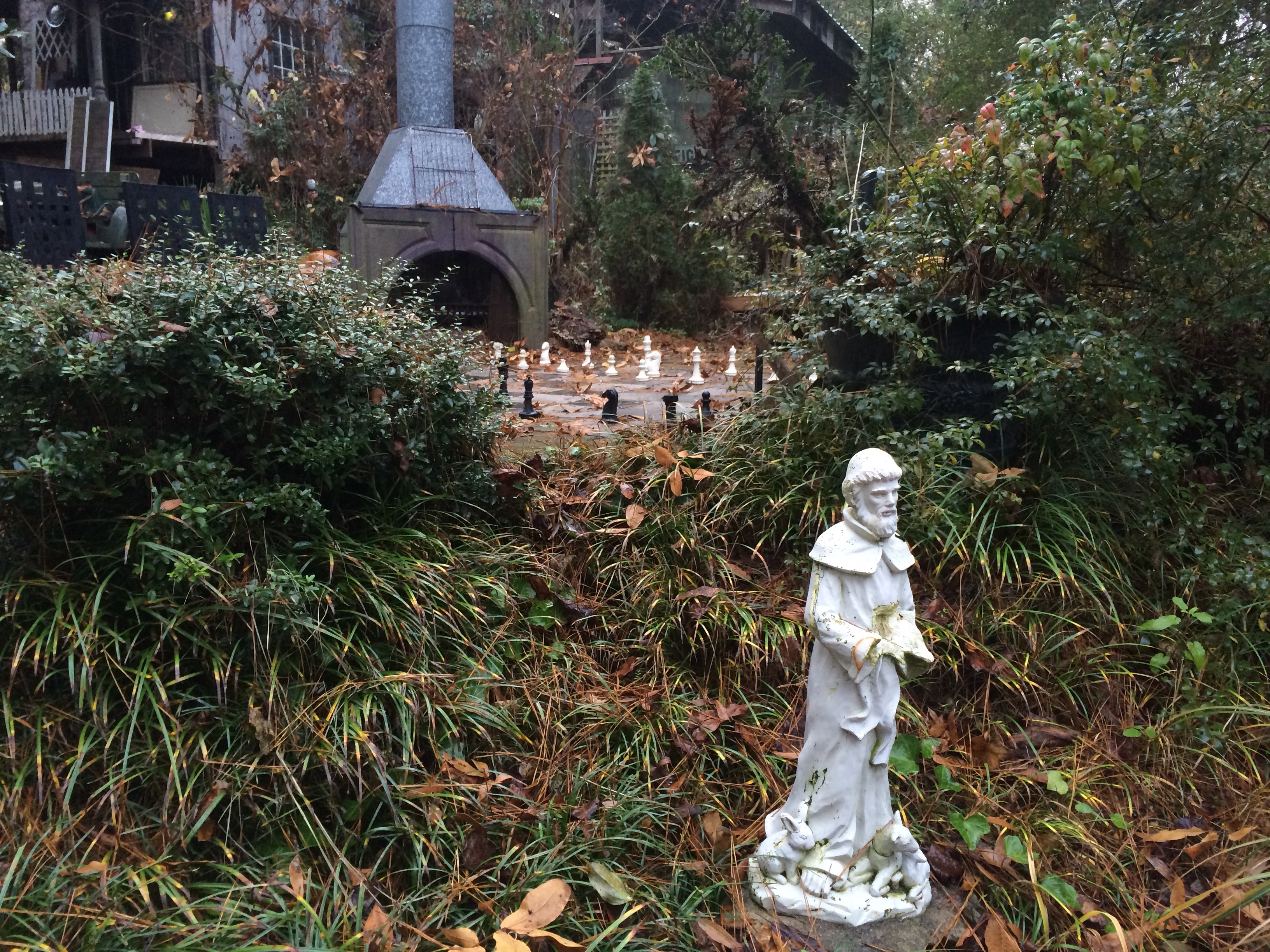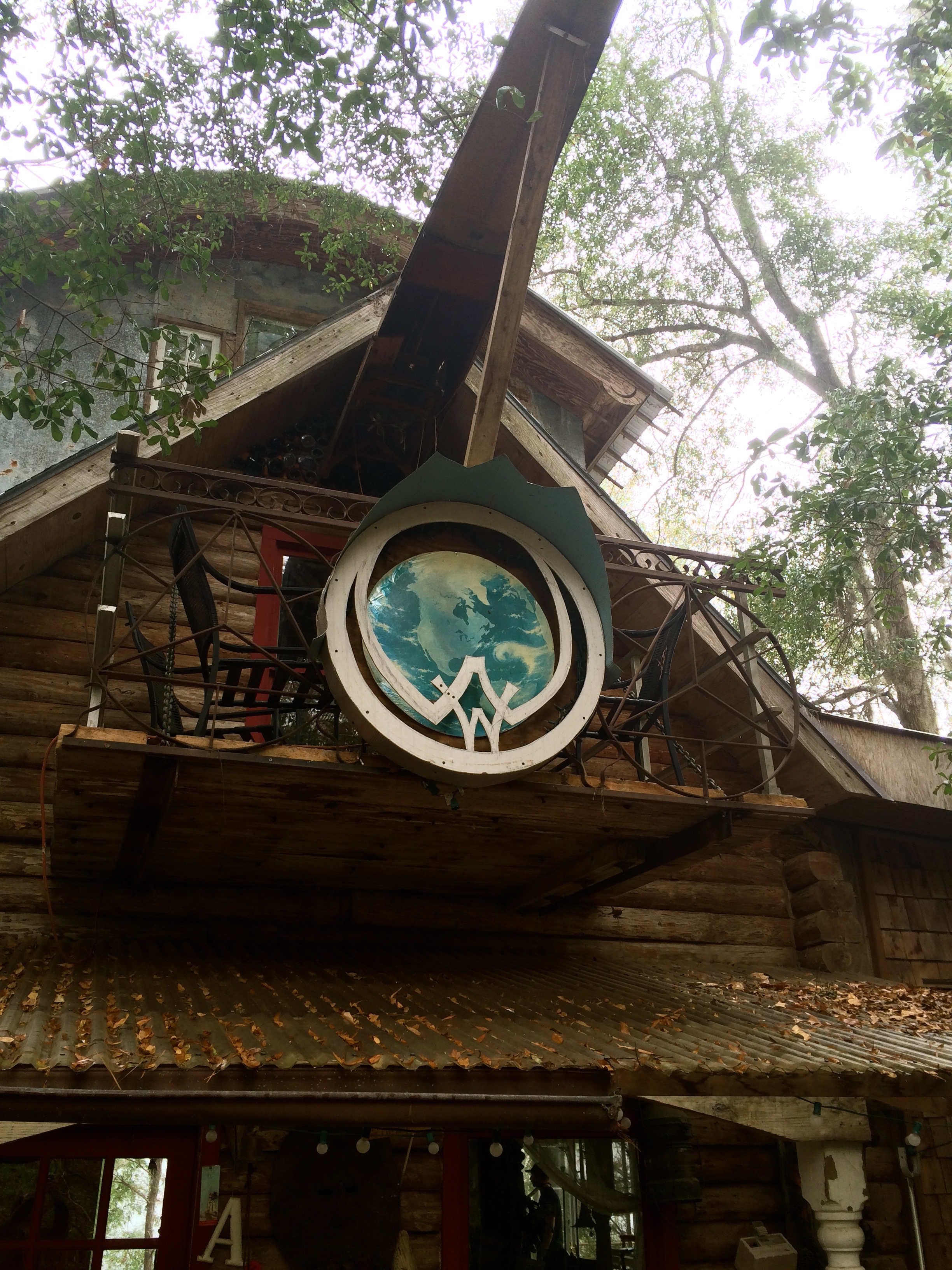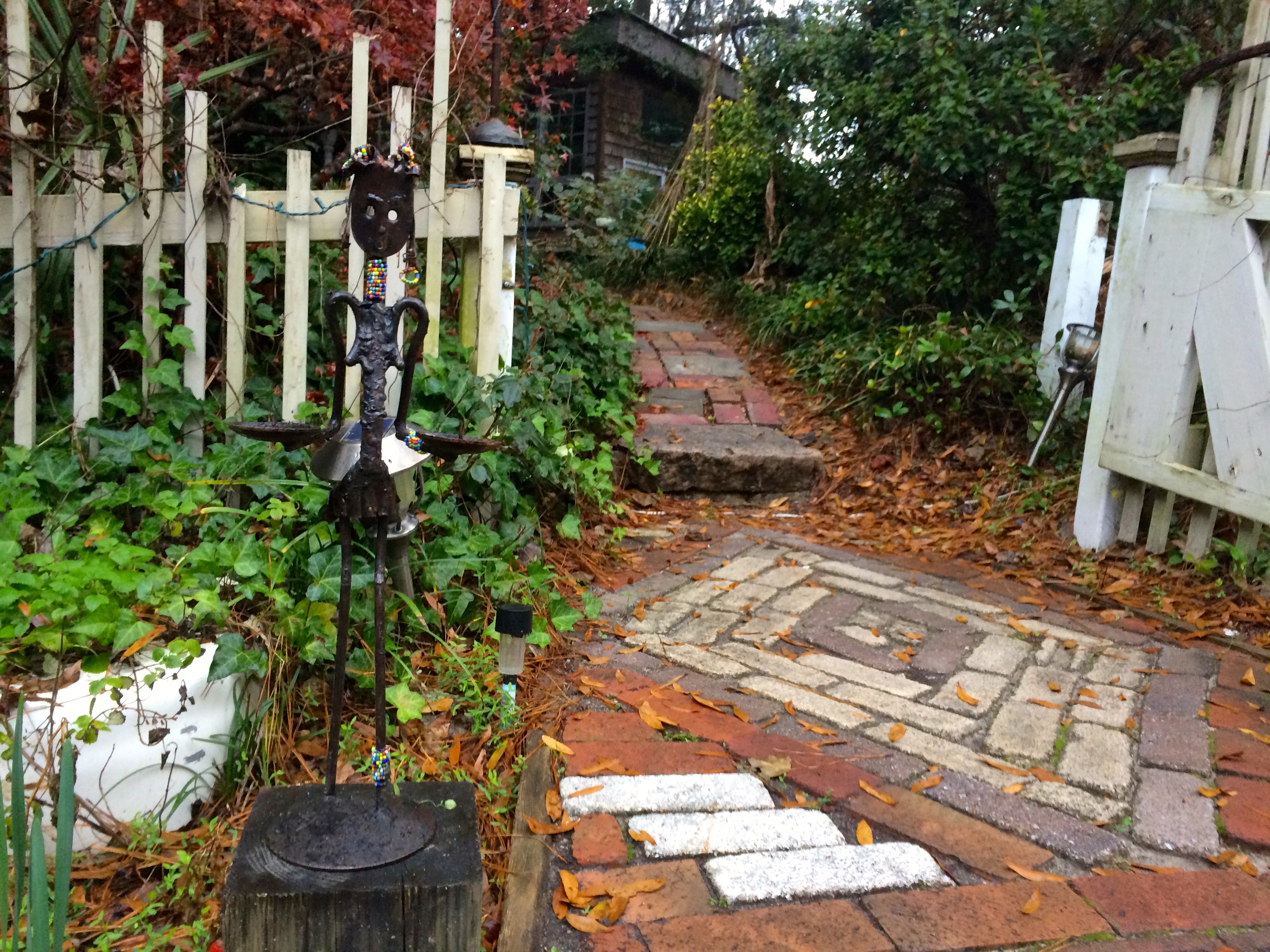 WalkerWorld is part Alice in Wonderland, part Hoarders. There is magic everywhere, from the globe made out of bricks in the driveway, to the life-size chess set by the outdoor fireplace to the art that covers every surface of the house. The interior of the main house is neat and fairly well kept, but there hundreds of interesting things to look at, from art to photos to the dozens of notecards with quotes written on them tacked all over the walls.